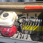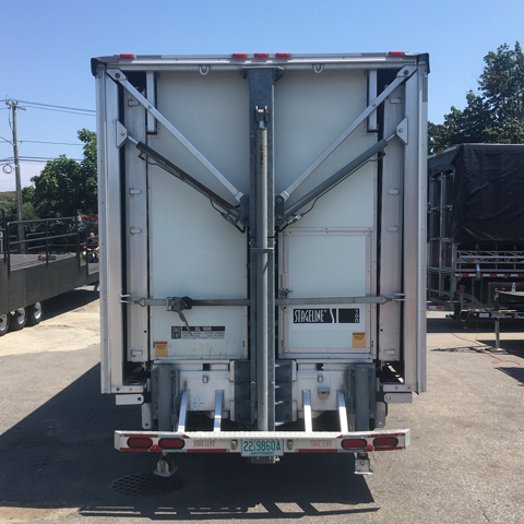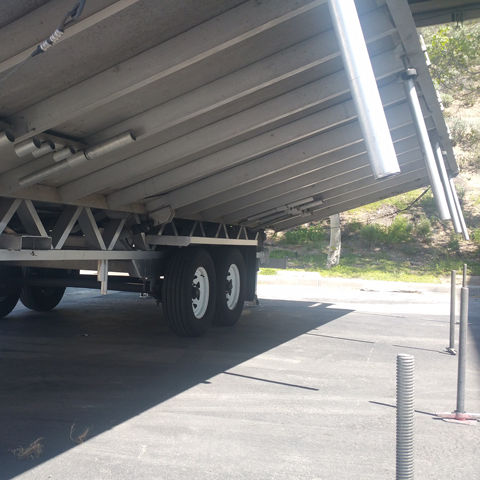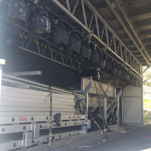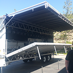 This garage kept hydraulic mobile stage unit includes: 24x20 Roof and Deck, 1 Set of Stairs, Railings, Skirting, 2 4x8 Sound Wings, Audio Fly Points and 4 Corners, Gas Powered Honda Engine, Spare Tire. This unit is reversible and does not include rear scrim, wind wall or banner extensions.